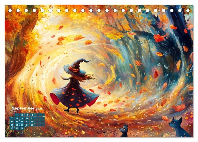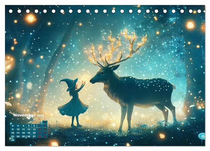 November: Auf einer verwunschenen Waldlichtung tanzt die fröhliche Hexe zusammen mit einem Hirsch mit leuchtendem Geweih.