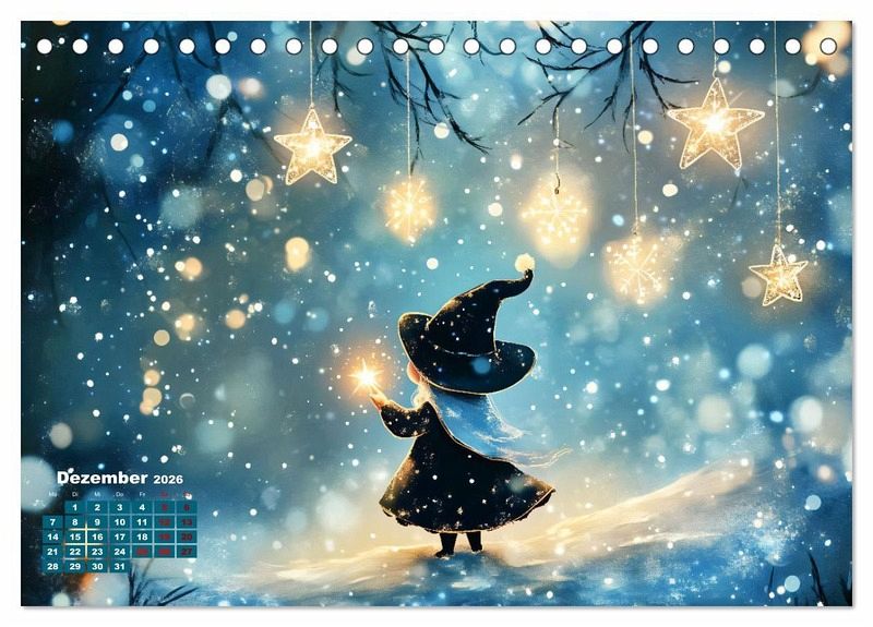Dezember: Zusammen schmücken die kleinen Hexen den Himmel mit strahlenden Sternen und wünschen frohe Weihnachten.