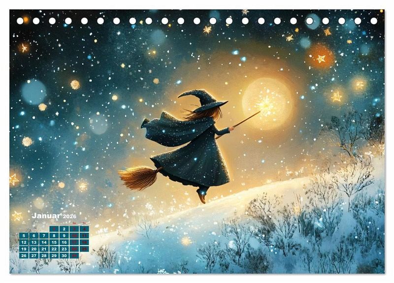 Januar: Die kleine Mitternachtshexe Ella zaubert funkelnde Schneeflocken, die über den Nachthimmel tanzen
