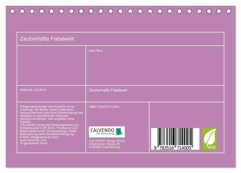 Tauche ein in die "Zauberhafte Fabelwelt" - ein einzigartiges, liebevoll ki-generiertes Erlebnis für kleine Entdecker und große Fantasie-Fans. Dieser bunte Begleiter führt Kinder durch spannende Abenteuer und magische Traumlandschaften voll wundersamer Tiere und geheimnisvoller Wesen. Jede Monatsszene ist detailreich und mit viel Herz in charmanten Wasserfarben gestaltet, um Freude, Staunen und Glücksmomente zu verschenken. Ob im Kinderzimmer oder als Geschenk - "Zauberhafte Fabelwelt" lädt jeden Tag dazu ein, neue Magie zu entdecken und die Welt mit neugierigen Augen zu sehen!