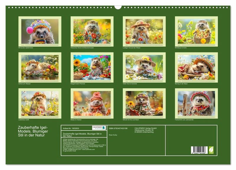 Begrüßen Sie das Jahr mit einem Lächeln und einem Hauch von stacheliger Mode! Dieser Kalender führt Sie durch zwölf Monate voll lieblicher Modetrends und lässiger Stachelstile, präsentiert von bezaubernden Igeln. Alle Illsutrationen in diesem Kalender wurden mit Hilfe von KI erstellt, um Ihnen diese kleinen und modischen Wesen in der Natur zu zeigen und Freude in Ihr Zuhause zu bringen.