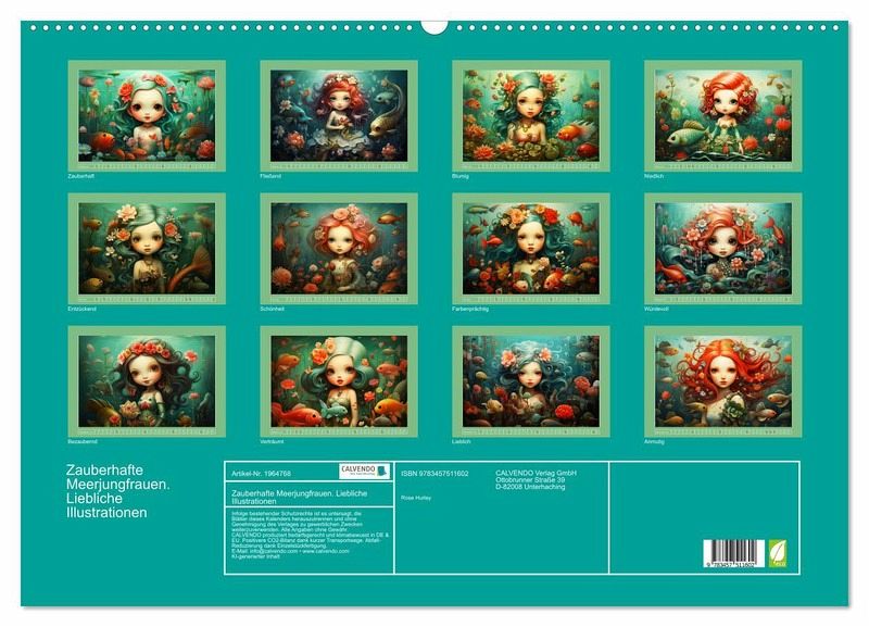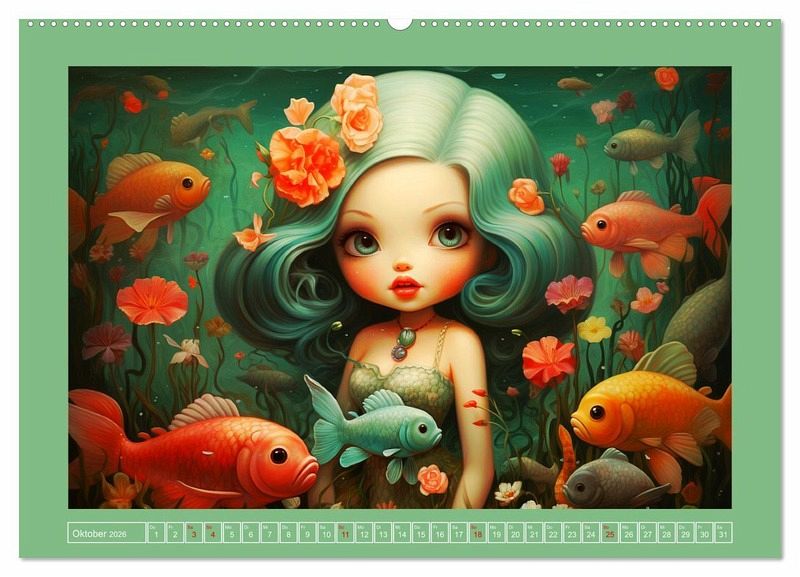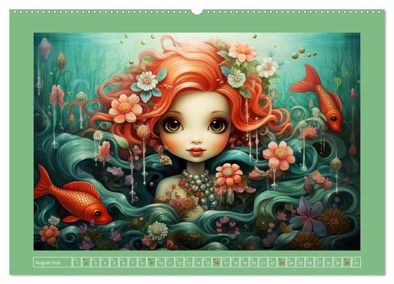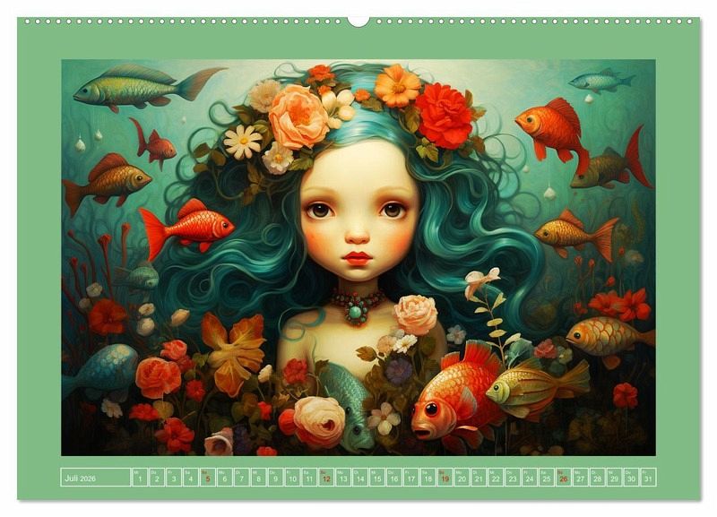 Entdecke die faszinierende Schönheit der Unterwasserwelt mit diesen lieblichen Meerjungfrauen. Jeder Monat zeigt ein liebevoll gestaltetes Porträt einer kleinen Nixe im surrealistischen Stil. Tauche ein in eine Welt voller Magie und lass dich von den Farben, den träumerischen Details und den geheimnisvollen Hintergründen verzaubern. Alle Illustrationen wurden mit Hilfe von KI generiert, und zeigen das ganze Jahr über anmutige und ätherische Schönheiten.