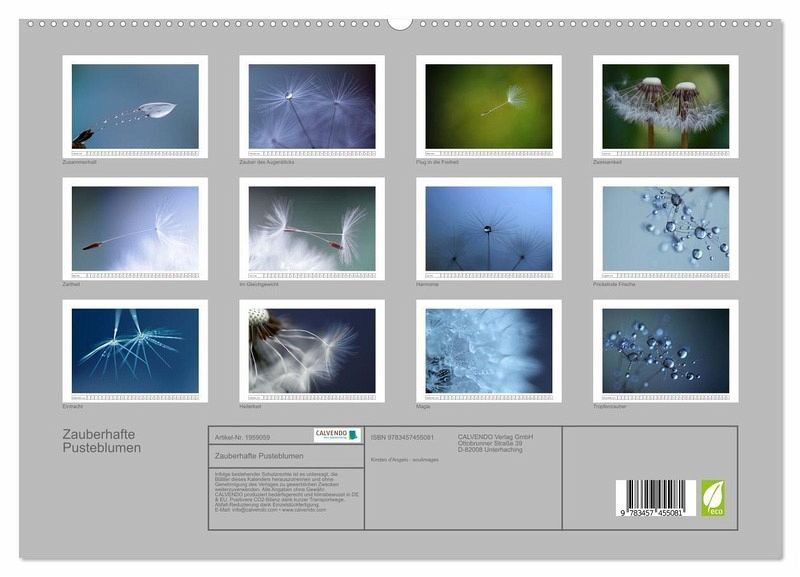 PREMIUM-LINIE - Brillanter Fotokalender mit 12 wunderschönen Motiven, Kunstdruck in Hochglanz in Museumsqualität.QUALITÄT - edle Materialien, stabile Rückwand mit 2 innovativen Einstecktaschen für eine optimale Präsentation an der Wand.NACHHALTIG - deutliche Abfallreduzierung durch bedarfsgerechte Einzelstückfertigung, umweltfreundliches FSC-zertifiziertes Papier, Produktion in Deutschland, klimabewusste Logistik.PERFEKTES GESCHENK - Kalender für Freunde und Familie, für Kinder und Erwachsene, jung und alt, zu Weihnachten, Geburtstag oder zwischendurch.Tauchen Sie ein in die zauberhafte Welt der Pusteblumen von Autor(in): Kirsten d'Angelo