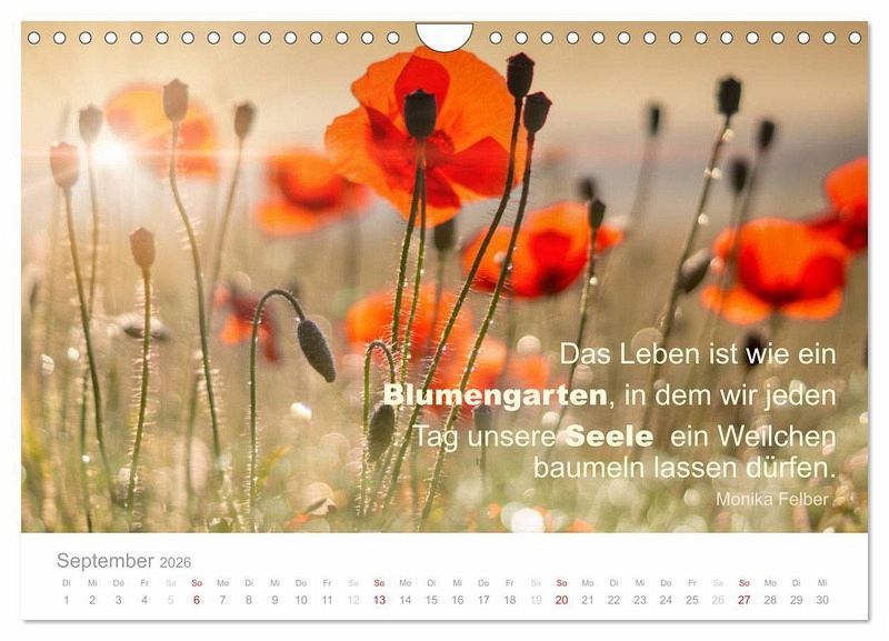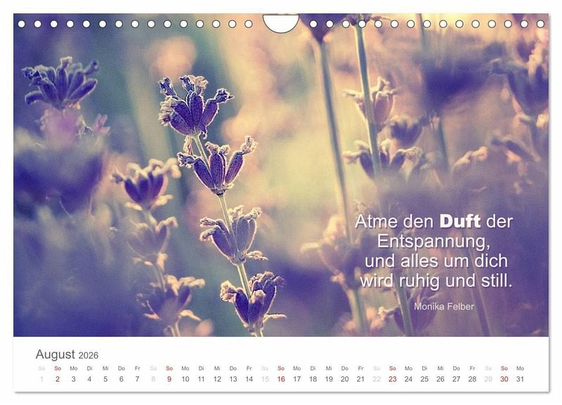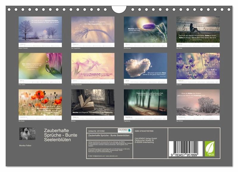 Gönnen sie sich eine kleine Auszeit vom hektischen Alltag, und tauchen sie ein in die wunderschönen Seelenblütenbilder von Monika Felber. Einzigartige Zitate und Sprüche begleiten sie durch ein wohltuendes, und entspanntes Kalenderjahr.