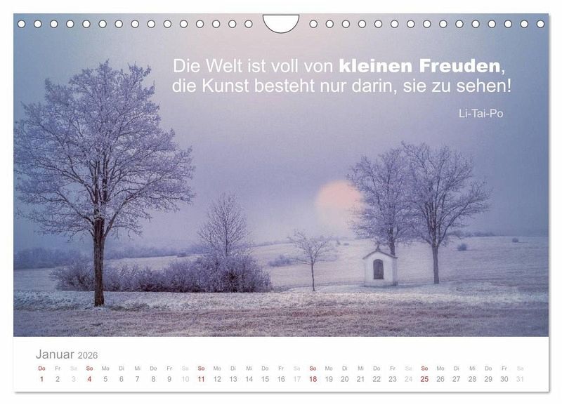 QUALITÄT - Hochwertiger Fotokalender mit 12 wunderschönen Motiven auf lichtbeständigem Bilderdruckpapier, robuste Spiralbindung mit Aufhängebügel.NACHHALTIG - deutliche Abfallreduzierung durch bedarfsgerechte Einzelstückfertigung, umweltfreundliches FSC-zertifiziertes Papier, Produktion in Deutschland, klimabewusste Logistik.PERFEKTES GESCHENK - Kalender für Freunde und Familie, für Kinder und Erwachsene, jung und alt, zu Weihnachten, Geburtstag oder zwischendurch.VIELFALT - Bildkalender in verschiedenen Formaten, z.B. DIN A5, DIN A4, DIN A3 sowie DIN A2. Ob Naturmotiv, Gemälde oder Fotos, ideal für ein persönliches Wohlfühlambiente.Sprüche und Bilder für die Seele begleiten sie durch das Jahr. von Autor(in): Foto Augenblicke-Zaubern mit Licht
