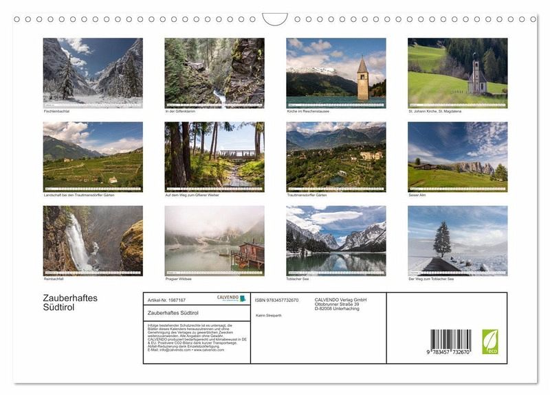 In diesem Fotokalender sehen sie wunderschöne Landschftsaufnahmen aus mehreren Regionen Südtirols, er soll zum Reisen anregen in diesem wunderbaren Urlaubsgebiet.