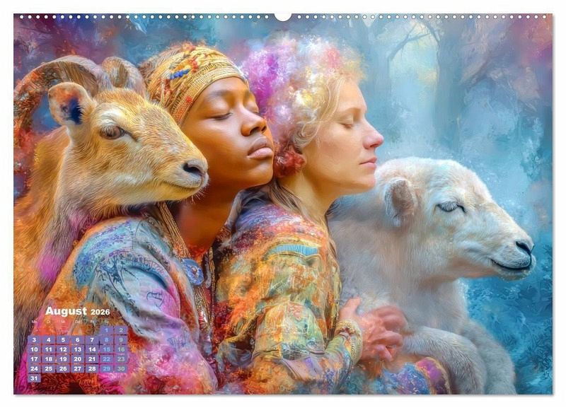 KI-generierte Werke zeigen Gesten der Liebe, tiefe Verbundenheit und Liebe zu Tieren. Die Werke sind malerisch, mit einer farbenfrohen Palette der Personen vor einem kühlenden blauen Hintergrund. Für alle Fans romantischer Harmonie.