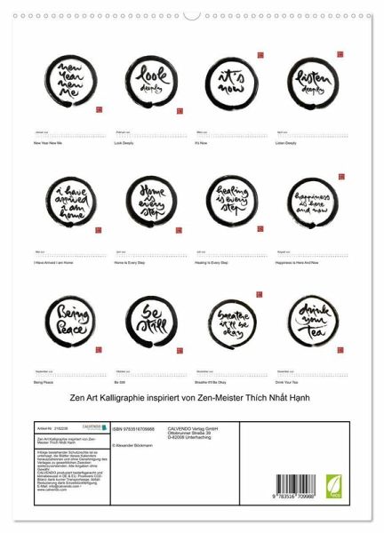 PREMIUM-LINIE - Brillanter Fotokalender mit 12 wunderschönen Motiven, Kunstdruck in Hochglanz in Museumsqualität.QUALITÄT - edle Materialien, stabile Rückwand mit 2 innovativen Einstecktaschen für eine optimale Präsentation an der Wand.NACHHALTIG - deutliche Abfallreduzierung durch bedarfsgerechte Einzelstückfertigung, umweltfreundliches FSC-zertifiziertes Papier, Produktion in Deutschland, klimabewusste Logistik.PERFEKTES GESCHENK - Kalender für Freunde und Familie, für Kinder und Erwachsene, jung und alt, zu Weihnachten, Geburtstag oder zwischendurch.Zen-Kalender mit von Thích Nh t H nh inspirierter Kalligraphie und Weisheiten aus der Plum Village Tradition - für Achtsamkeit und Frieden im Alltag. von Autor(in): Alexander Böckmann