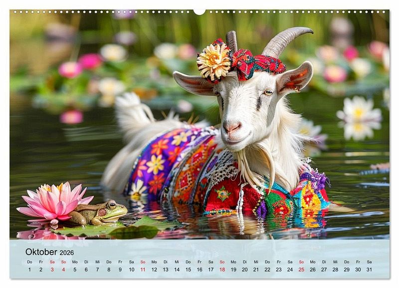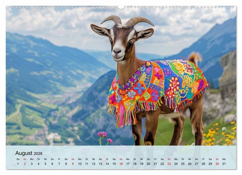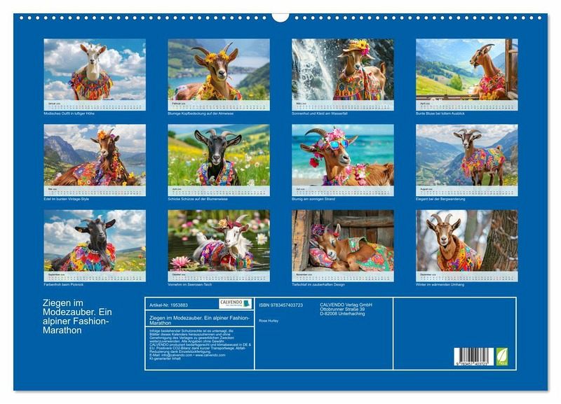 Tauchen Sie ein in die wundersame Welt der Ziegenmode! Diese Bilder wurden mit Hilfe von KI erstellt und zeigen moderne Ziegen, die sich in den Bergen und auf den Wiesen als echte Fashionistas präsentieren. Von eleganter Kopfbedeckung bis hin zum verspielten Schal, zeigen unsere feschen Vierbeiner die neuesten Modetrends. Ein Kalender der Spaß macht und alle Ziegenfreunde erfreuen wird.