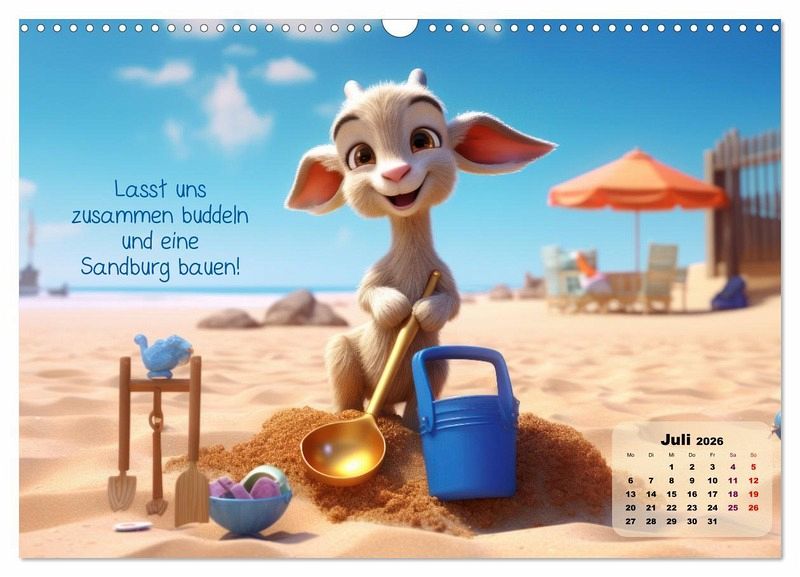 Farbenfrohe Bilder, die mithilfe von KI erstellt wurden, zeigen Ziegenkinder bei ihrer Freizeitgestaltung. Mit passenden Sprüchen laden die Zicklein die Kinder zum Mitmachen ein. Ein bezaubernder Wandschmuck für das Kinderzimmer.