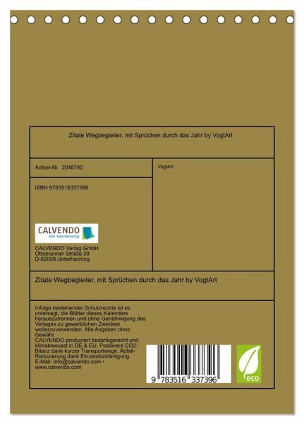 QUALITÄT - Hochwertiger Fotokalender mit 12 wunderschönen Motiven auf lichtbeständigem Bilderdruckpapier, robuste Spiralbindung.NACHHALTIG - deutliche Abfallreduzierung durch bedarfsgerechte Einzelstückfertigung, umweltfreundliches FSC-zertifiziertes Papier, Produktion in Deutschland, klimabewusste Logistik.PERFEKTES GESCHENK - Kalender für Freunde und Familie, für Kinder und Erwachsene, jung und alt, zu Weihnachten, Geburtstag oder zwischendurch.VIELFALT - Bildkalender in verschiedenen Formaten, z.B. DIN A5, DIN A4, DIN A3 sowie DIN A2. Ob Naturmotiv, Gemälde oder Fotos, ideal für ein persönliches Wohlfühlambiente.mit wegweisenden Zitaten durch`s Jahr von Autor(in): VogtArt