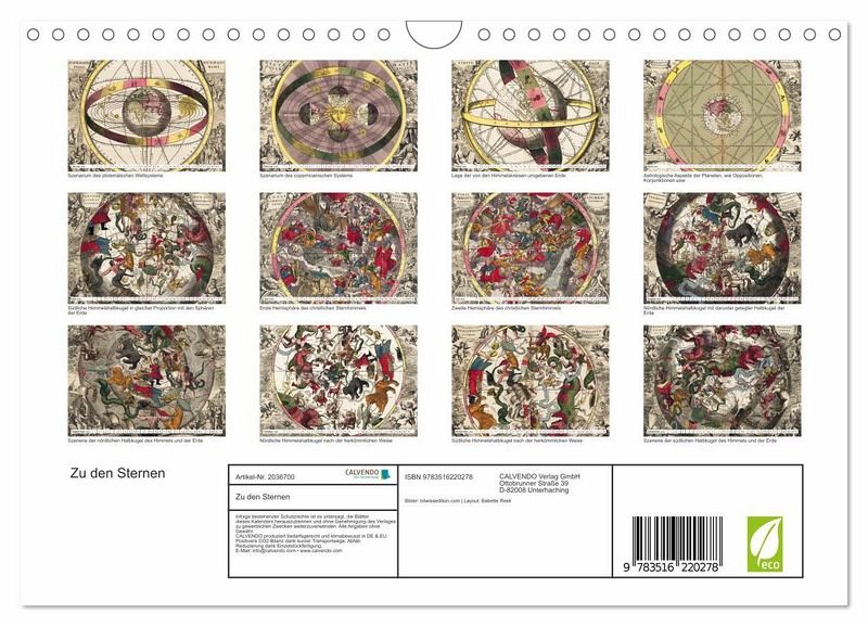 Die Faszination des Sternenhimmels zieht uns seit je in ihren Bann und führte 1660 zur Veröffentlichung eines der schönsten Sternatlanten: der Harmonia Macrocosmica von Andres Cellarius. Die detailreichen, noch figürlich dargestellten Sternbilder versinnbildlichen in bezaubernder Weise den Zusammenhang zwischen Mythologie und moderner Astronomie. Der Kalender präsentiert großformatig 12 Ausschnitte der Kupfertafeln - Weltbilder und Sternenkarten - der Harmonia Macrocosmica mit Hintergundinformationen zu den Abbildungen. Lassen Sie sich entführen vom Zauber der Sternbilder. Eine besondere Geschenkidee für Amateurastronomen, Astrologen, Sternenhimmelgucker und Kunstliebhaber. Oder schenken Sie ihn sich doch einfach selbst!