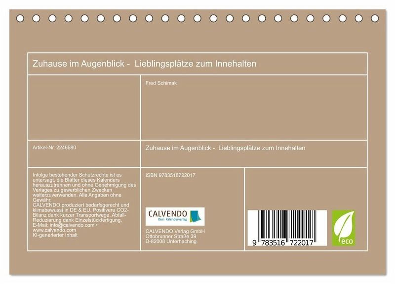 QUALITÄT - Hochwertiger Fotokalender mit 12 wunderschönen Motiven auf lichtbeständigem Bilderdruckpapier, robuste Spiralbindung.NACHHALTIG - deutliche Abfallreduzierung durch bedarfsgerechte Einzelstückfertigung, umweltfreundliches FSC-zertifiziertes Papier, Produktion in Deutschland, klimabewusste Logistik.PERFEKTES GESCHENK - Kalender für Freunde und Familie, für Kinder und Erwachsene, jung und alt, zu Weihnachten, Geburtstag oder zwischendurch.VIELFALT - Bildkalender in verschiedenen Formaten, z.B. DIN A5, DIN A4, DIN A3 sowie DIN A2. Ob Naturmotiv, Gemälde oder Fotos, ideal für ein persönliches Wohlfühlambiente.Ein Jahr voller Lieblingsorte zum Innehalten von Autor(in): Michaela Spreider