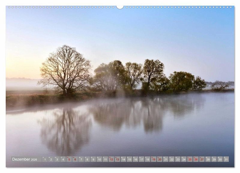 Dezember: Nebel am Ufer im Morgengrauen am Fluss Mulde, Biosphärenreservat Mittlere Elbe