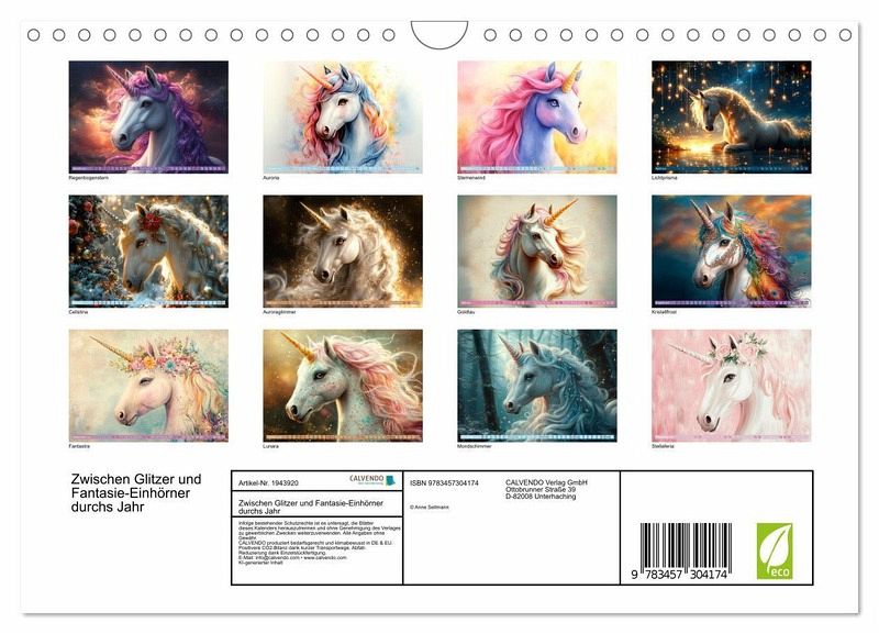 12 kunstvoll gestaltete Motive, die die Schönheit und Magie der Einhörner einfangen.
