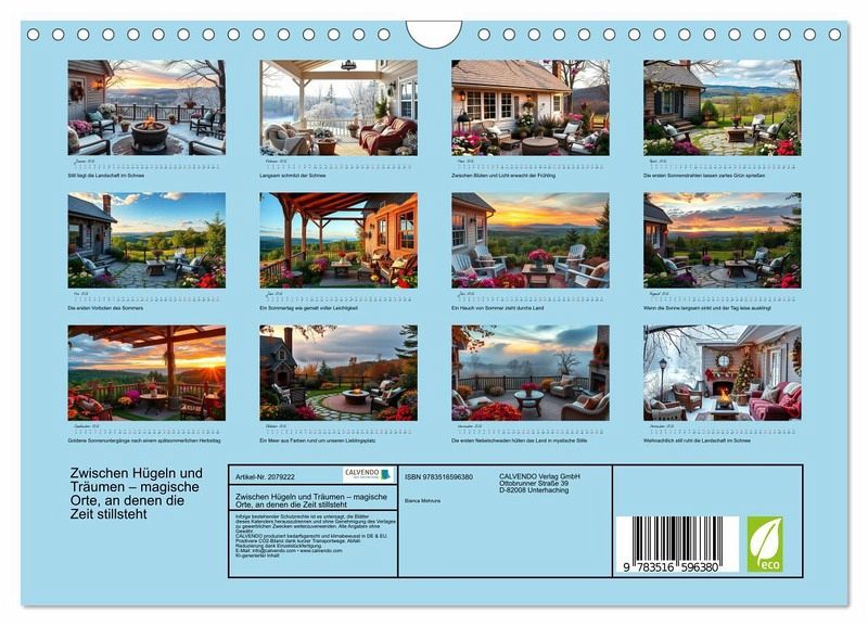 "Zwischen Hügeln und Träumen" entführt dich Monat für Monat an magische Orte - romantische Cottages, verträumte Sitzplätze und weite Landschaften, die einfach nur zum Durchatmen einladen.