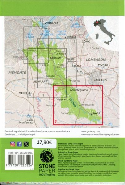 La carta escursionistica Geo4Map della Valle del Ticino n° 02 è realizzata: in scala 1:50.000 con un'ampia rappresentazione del territorio, formato aperto di cm. 104 x 76, formato chiuso cm 13 x 19, a colori. Il territorio cartografato comprende la parte del territorio sud della Valle del Ticino. Stampata su carta Stone Paper, composta da polvere di pietra, è estremamente durevole, idrorepellente, anti riflesso. Le curve di livello a 20 metri, i particolari rocciosi disegnati a mano, i colori e i simboli sono solo alcune delle caratteristiche che permettono di leggere facilmente la cartografia. Nel retro sono state inserite importanti nozioni di orientamento e primo soccorso, insieme a descrizioni del territorio, flora e fauna presenti nella valle. Das Urheberrecht an bibliographischen und produktbeschreibenden Daten und an den bereitgestellten Bildern liegt bei Informazioni Editoriali, I.E. S.r.l., oder beim Herausgeber oder demjenigen, der die Genehmigung erteilt hat. Alle Rechte vorbehalten.