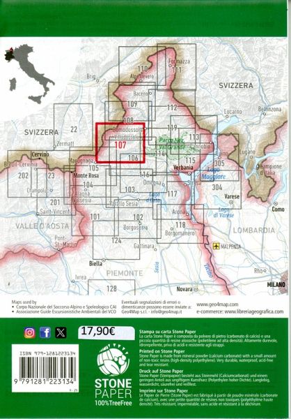 La carta escursionistica Geo4Map della Valle Antrona n° 107 è realizzata: in scala 1:25.000 con un'ampia rappresentazione del territorio, formato aperto di cm. 104 x 76, formato chiuso cm 13 x 19, a colori. Il territorio cartografato comprende Valle Antrona, il Pizzo d'Andolla, Villadossola. Stampata su carta Stone Paper, composta da polvere di pietra, è estremamente durevole, idrorepellente, anti riflesso. Le curve di livello a 20 metri, i particolari rocciosi disegnati a mano, i colori e i simboli sono solo alcune delle caratteristiche che permettono di leggere facilmente la cartografia. Nel retro sono state inserite importanti nozioni di orientamento e primo soccorso in italiano, inglese, francese e tedesco.