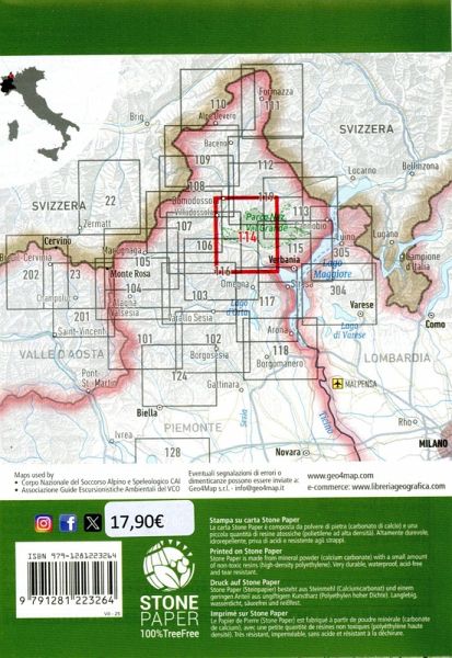 La carta escursionistica Geo4Map è realizzata in scala 1:25.000 con sistema di riferimento WGS84 UTM zona 32N, con un'ampia rappresentazione del territorio a colori con piega a fisarmonica facile da ripiegare. La carta escursionistica Geo4Map della VAL GRANDE n° 114 è realizzata: formato aperto di cm. 104 x 76 formato chiuso cm 13 x 19, a colori. Il territorio cartografato comprende la maggior parte del territorio del Parco Nazionale della Val Grande Stampata su carta Stone Paper, composta da polvere di pietra, è estremamente durevole, idrorepellente, anti riflesso. Le curve di livello a 20 metri, i particolari rocciosi disegnati a mano, i colori e i simboli sono solo alcune delle caratteristiche che permettono di leggere facilmente la cartografia. Contenuti cartografici: Tutti i sentieri indicati in base alle difficoltà; Coordinate ben visibili per un uso congiunto al GPS; Curve di livello a 20 metri; Modello tridimensionale del terreno; Particolari rocciosi disegnati a mano; Informazioni topografiche come fiumi, monti, abitati, strade arricchite da altri elementi come falesie e piste ciclabili; Legenda in quattro lingue: italiano, inglese, tedesco e francese. Nel retro sono state inserite importanti nozioni di orientamento e primo soccorso in italiano, inglese, francese e tedesco.