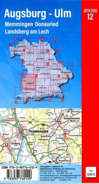 Für einen großräumigen Überblick bei weiten Touren liegt man mit der ATK100 genau richtig. Landschaftlich zusammenhängende Gebiete sind charakteristisch abgebildet, und der Karteninhalt ist auch im Maßstab 1 : 100 000 leicht verständlich.19 Einzelblätter stellen Bayern flächendeckend dar. Ein Kartenblatt umfasst ca. 85 km x 90 km.Was bietet die ATK100?- weiträumige Tourenplanung auf den ausgeschilderten Fernrad- und Fernwanderwegen- übersichtliche Darstellung großer Regionen- umfangreiches Spektrum an Freizeiteinrichtungen und Sehenswürdigkeiten- anschauliche Wiedergabe der GeländeformenDie ATK100-12 Augsburg-Ulm im Maßstab 1:100 000 bildet das Kernland des bayerischen Schwabens zwischen Iller, Lech und Donau ab.Die flachen Flusstäler sind wie geschaffen für ausgedehnte Radtouren, wie z.B. auf der Romantischen Straße oder der Schwäbischen Kartoffeltour.Der Naturpark Augsburg-Westliche Wälder bietet stadtnahe Erholung und wird durch eine Vielzahl an Wander- und Radwegen erschlossen. Zum Beispiel durchzieht der Wanderweg Lueg ins Land den Naturpark von Nord nach Süd und der Radweg Sieben-Schwaben-Tour umrundet ihn vollständig.Sehenswert ist außerdem die Altstadt von Augsburg mit der Fugggerei - der ältesten bestehenden Sozialsiedlung der Welt. In Ulm lockt der Ulmer Münster mit dem höchsten Kirchturm der Welt sowie das Ulmer Museum mit der berühmten Skulptur des Löwenmenschen, welcher in einer Höhle im Lonetal gefunden wurde. Insgesamt wurden sechs Höhlen auf der Schwäbischen Alb 2017 zum UNESCO-Welterbe erklärt.Für Ausflüge mit Kindern sind das Legoland und der Peppa Pig Park bei Günzburg oder der Bahnpark in Augsburg mit Sicherheit lohnende Ziele. Die Erlebnisbäder Donaubad in Neu-Ulm oder das Titania in Neusäß versprechen Badespaß für die ganze Familie.Kartenblatt ATK100-12 Augsburg-Ulm:REGIONEN: Schwaben, Holzwinkel, Reischenau, Donauried, Stauden, Lechfeld, Allgäu, Schwäbische AlbORTE: Augsburg, Ulm, Donauwörth, Dillingen, Günzburg, Königsbrunn, Neu-Ulm, Illertissen, Memmingen, Landsberg am Lech, Friedberg, Neusäß