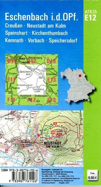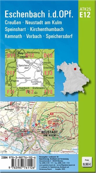 Wer es genau wissen will, greift zur ATK25. Diese Kartenserie im Maßstab 1:25000 bildet mit ihrer detaillierten Darstellung das komplette Verkehrsnetz mit allen Straßen und Wegen ab.237 Einzelblätter stellen Bayern flächendeckend dar. Ein Kartenblatt umfasst ca. 21 km x 22 km.Was bietet die ATK25?- individuelle Freizeitgestaltung mit allen ausgeschilderten Wander- und Radwanderwegen- sichere Orientierung auch abseits der markierten Routen- umfangreiches Spektrum an Freizeiteinrichtungen und Sehenswürdigkeiten- anschauliche Wiedergabe der GeländeformenKartenblatt ATK25-E12 Eschenbach i.d.OPf.:REGION: Oberpfalz, OberfrankenORTE: Eschenbach i.d.OPf., Creußen, Neustadt am Kulm, Speinshart, Kirchenthumbach, Kemnath, Vorbach, Speichersdorf, Kastl, Trabitz, Emtmannsberg