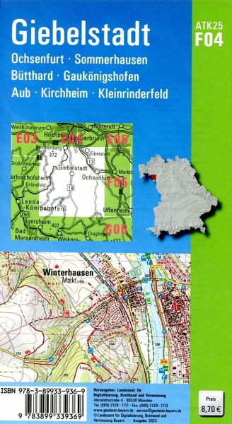 Wer es genau wissen will, greift zur ATK25. Diese Kartenserie im Maßstab 1:25000 bildet mit ihrer detaillierten Darstellung das komplette Verkehrsnetz mit allen Straßen und Wegen ab.237 Einzelblätter stellen Bayern flächendeckend dar. Ein Kartenblatt umfasst ca. 21 km x 22 km.Was bietet die ATK25?- individuelle Freizeitgestaltung mit allen ausgeschilderten Wander- und Radwanderwegen- sichere Orientierung auch abseits der markierten Routen- umfangreiches Spektrum an Freizeiteinrichtungen und Sehenswürdigkeiten- anschauliche Wiedergabe der GeländeformenKartenblatt ATK25-F04 Giebelstadt:REGION: Unterfranken, Mittelfranken, Baden-Württemberg, Ochsenfurter GauORTE: Giebelstadt, Ochsenfurt, Sommerhausen, Winterhausen Bütthard, Gaukönigshofen, Aub, Kirchheim, Kleinrinderfeld