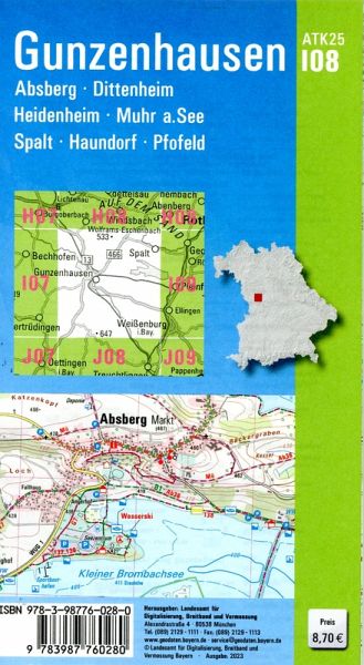 Wer es genau wissen will, greift zur ATK25. Diese Kartenserie im Maßstab 1:25000 bildet mit ihrer detaillierten Darstellung das komplette Verkehrsnetz mit allen Straßen und Wegen ab.237 Einzelblätter stellen Bayern flächendeckend dar. Ein Kartenblatt umfasst ca. 21 km x 22 km.Was bietet die ATK25?- individuelle Freizeitgestaltung mit allen ausgeschilderten Wander- und Radwanderwegen- sichere Orientierung auch abseits der markierten Routen- umfangreiches Spektrum an Freizeiteinrichtungen und Sehenswürdigkeiten- anschauliche Wiedergabe der GeländeformenKartenblatt ATK25-I08 Gunzenhausen:REGION: Mittelfranken, Fränkisches Seenland, HahnenkammORTE: Gunzenhausen, Absberg, Dittenheim, Heidenheim, Muhr a.See, Spalt, Haundorf, Pfofeld, Theilenhofen, Markt Berolzheim