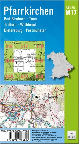 Wer es genau wissen will, greift zur ATK25. Diese Kartenserie im Maßstab 1:25000 bildet mit ihrer detaillierten Darstellung das komplette Verkehrsnetz mit allen Straßen und Wegen ab.237 Einzelblätter stellen Bayern flächendeckend dar. Ein Kartenblatt umfasst ca. 21 km x 22 km.Was bietet die ATK25?- individuelle Freizeitgestaltung mit allen ausgeschilderten Wander- und Radwanderwegen- sichere Orientierung auch abseits der markierten Routen- umfangreiches Spektrum an Freizeiteinrichtungen und Sehenswürdigkeiten- anschauliche Wiedergabe der GeländeformenKartenblatt ATK25-M17 Pfarrkirchen:REGION: Niederbayern, RottalORTE: Pfarrkirchen, Bad Birnbach, Tann, Triftern, Wittibreut, Dietersburg, Postmünster, Reut, Stubenberg