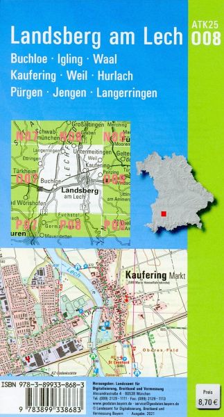 Wer es genau wissen will, greift zur ATK25. Diese Kartenserie im Maßstab 1:25000 bildet mit ihrer detaillierten Darstellung das komplette Verkehrsnetz mit allen Straßen und Wegen ab.237 Einzelblätter stellen Bayern flächendeckend dar. Ein Kartenblatt umfasst ca. 21 km x 22 km.Was bietet die ATK25?- individuelle Freizeitgestaltung mit allen ausgeschilderten Wander- und Radwanderwegen- sichere Orientierung auch abseits der markierten Routen- umfangreiches Spektrum an Freizeiteinrichtungen und Sehenswürdigkeiten- anschauliche Wiedergabe der GeländeformenKartenblatt ATK25-O08 Landsberg am Lech:REGION: Schwaben, Oberbayern, Lechfeld, Allgäu, Kirchweihtal, LechrainORTE: Landsberg am Lech, Buchloe, Igling, Waal, Kaufering, Weil, Hurlach, Pürgen, Jengen, Langerringen, Unterdießen, Lamerdingen