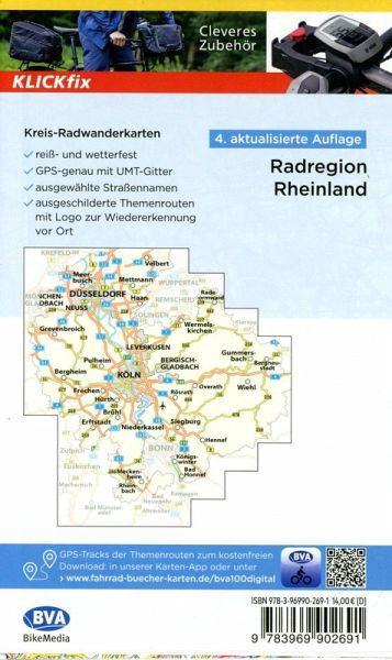 Radwanderkarte BVA Radwandern in der RadRegionRheinlandReiß- und wetterfest und mit GPS-Track Download der ausgeschilderten Routen.