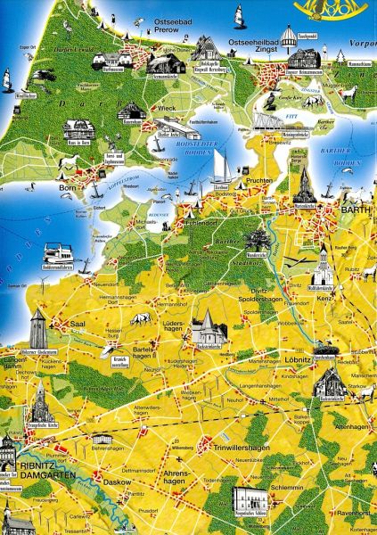 Die Halbinselkette als Synonym für ursprüngliche Natur und kilometerlange Ostseestrände sowie der Unterlauf des Recknitztals stehen im Mittelpunkt der neuen Ferienkarte. Die Karte umfasst den gesamten Darß sowie das Hinterland mit Recknitztal, Marlow, Bad Sülze, Richtenberg, Franzburg und Grimmen. Die einmalige Boddenlandschaft, kulturelle und historische Sehenswürdigkeiten sowie eine der reizvollsten Flussniederungen Norddeutschlands laden zum Erholen, Genießen und Erleben ein.