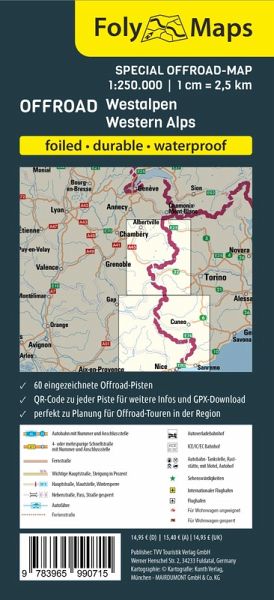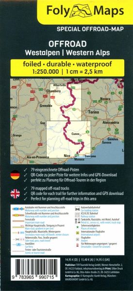 Entdecke die Offroad-Faszination der Westalpen mit der FolyMap Spezialkarte Offroad Westalpen - dein unentbehrlicher Wegweiser für abenteuerliches Offroad-Fahren. Speziell für diese Region gestaltet, bietet die Karte 60 ausgewählte Offroad-Strecken, jede markiert und begleitet von nützlichen Basisinfos und einem QR-Code. Ein Scan des QR-Codes enthüllt detaillierte Routenbeschreibungen und den GPX-Download zu der Piste. Diese folierte Karte ist robust, wetter- und reißfest sowie beschreibbar, ideal für deine Notizen und Pläne. Ihr handliches Format und die präzise Kartographie machen sie zum Must-have für Offroad-Enthusiasten, die die wilden und teilweise spektakulären Wege der Westalpen erkunden wollen.Die Features der FolyMap Offroad Westalpen im Überblick :_ 60 eingezeichnete Offroad Pisten _ Basis Informationen wie Schwierigkeitsgrad und Länge zu jeder Piste_ foliert_ strapazierfähig_ wetterfest_ Maßstab 1:250.000_ Übersichtliche KartographieEntdecke die Welt der FolyMaps Offroad Spezialkarten - dein unentbehrlicher Begleiter für außergewöhnliche Offroad-Abenteuer. Diese spezielle Serie konzentriert sich auf die besten Offroad Region Europas und jeweils über 50 sorgfältig ausgewählte Offroad-Pisten der jeweiligen Region. Jede Piste ist auf der Karte eingezeichnet und wird durch stichpunktartige Basisinformationen und einen praktischen QR-Code ergänzt. Scanne den QR-Code, um detaillierte Streckenbeschreibungen und den GPX-Download für jede Route zu erhalten. Die FolyMap Offroad Spezialkarten sind robust, wetterfest, reißfest und beschreibbar - ideal für das Notieren deiner Entdeckungen und Pläne. Mit einem handlichen Format und präzisen Kartographie sind diese Karten perfekt für jeden Offroad-Enthusiasten, der Wert auf Qualität, Zuverlässigkeit und das Entdecken abenteuerlicher Pfade legt.