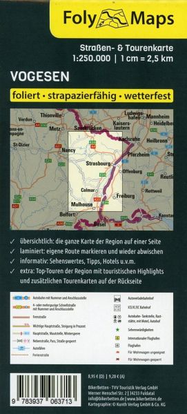 FolyMaps Straßen- und TourenkartenDie robusten Karten mit den vielen Infos - foliert - strapazierfähig - wetterfestDie neuen FolyMaps Straßen- & Tourenkarten vereinen eine hochwertige Straßenkarte auf der Vorderseite mit zusätzlichen Tourentipps und touristischen Highlights auf der Rückseite. Natürlich sind die Karten foliert und damit wetterfest, reißfest sowie mit einem wasserlöslichen Stift beschreibbar. So lassen sich eigene Routen oder Anmerkungen eintragen und später wieder entfernen. Zusätzlich erscheinen in dieser Reihe praktische Spezialkarten zu außergewöhlichen Reisezielen oder Themen.