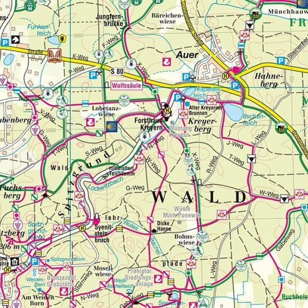 Umfasst das Gebiet des Moritzburger Teichgebietes mit Niederau, Weinböhla, Coswig Moritzburg, Berbisdorf, Bärnsdorf, Volkersdorf und Friedewald. Weiterhin sind dargestellt Meißen mit dem Spaargebirge, ein Teil der Linkselbischen Täler und Radebeul. Beinhaltet alle markierten Wanderwege als auch Radwege mit deren Kennzeichnung. Durch die Darstellung der naturkundlichen, geologischen und historischen Informationen wird der Kartennutzer auf die großen und kleinen Sehenswürdigkeiten rechts und links des Weges aufmerksam gemacht. Auf der Kartenrückseite befinden sich Text und Bilder zu den einzelnen Ortschaften und zu den Landschaftsschutzgebieten.