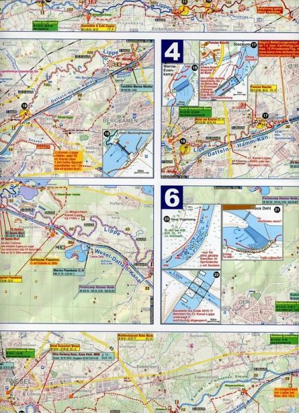 Radwandern: Römer-Lippe-Tour ab Detmold über Hermannsdenkmal bis Xanten mit Angaben zur Wegbeschaffenheit, Steigungen, radlergeeignete Quartiere, Restaurants, Lebensmittel, Bäcker...Kanuwandern: Befahrbarkeiten, gesetzliche Bestimmungen, Gefahren, Naturschutz, Detailskizzen der Wehre, Wassersportvereine, Rastplätze...Yachtsport: Wesel-Datteln-Kanal und Datteln-Hamm-Kanal, Schleusen, Liegeplätze...
