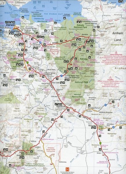 A fully indexed map of the Northern Territory (NT) at a scale of 1:1,750,000. Marked on the map are national parks, camping areas, rest areas, caravan parks, points of interest and 24-hour fuel accompanied by a distance grid.