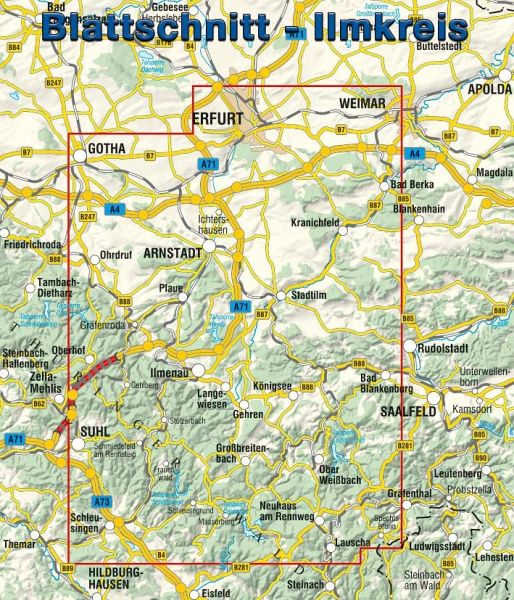 Der Ilmkreis erstreckt sich südlich von der A4 bis zum Thüringer Wald und seinem beliebtesten Wanderweg, dem Rennsteig. Der Ilmkreis bietet vom Thüringer Becken bis zu den Höhen des Thüringer Waldes und entlang der prägenden Flusstäler attraktive Rad- und Wandermöglichkeiten an. Einer der beliebteste Wanderweg Deutschlands, der Rennsteig durchzieht den Landkreis von Oberhof bis Masserberg und der Goethewanderweg, der von Ilmenau über Manebach nach Stützerbach an das Wirken von J. W. v. Goethe in der Region erinnert, erfreut sich einen guten Resonanz.Die neue 3. Ausgabe der reiß- und wetterfesten Rad- und Wanderkarte "Ilmkreis" stellt im Maßstab 1:50 000 die Region des Ilmkreises mit dem umfangreichen Rad- und Wanderwegenetz vor. Ein UTM-Gitter ermöglicht die Nutzung eines GPS Gerätes und die integrierte Geländeschummerung visualisiert das Mittelgebirge.