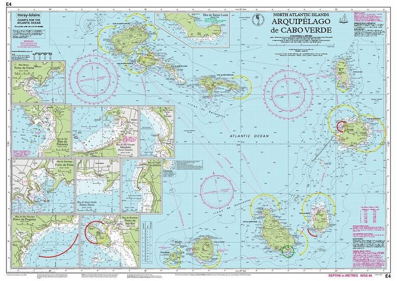 On this edition the chart specification has been improved to show coloured light flashes. Depths have been updated from the latest available surveys where available. Completed harbour works at Palmeira (Sal) are included as are the latest reclamation works at Praia (Santiago). There has been general updating throughout.