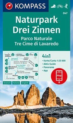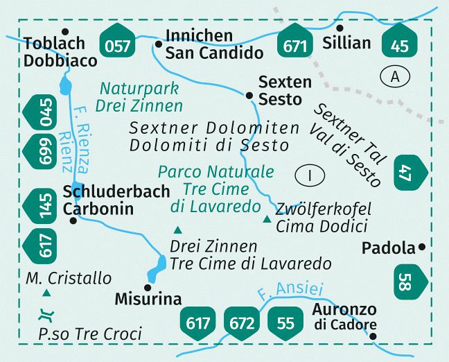 Diese Karte mit Panorama zeigt die "Sextner Sonnenuhr" (Elferkofel, Zwölferkofel, Einserkofel), sowie die Cadinigruppe. Die Tourismusorte Sexten/Moos; Innichen und Toblach sind Ausgangs- und Zielorte für leichte Wanderungen bis exponierte Berg- und Klettertoren in den Naturpark Sextner Dolomiten/Parco Naturale Dolomiti di Sesto.