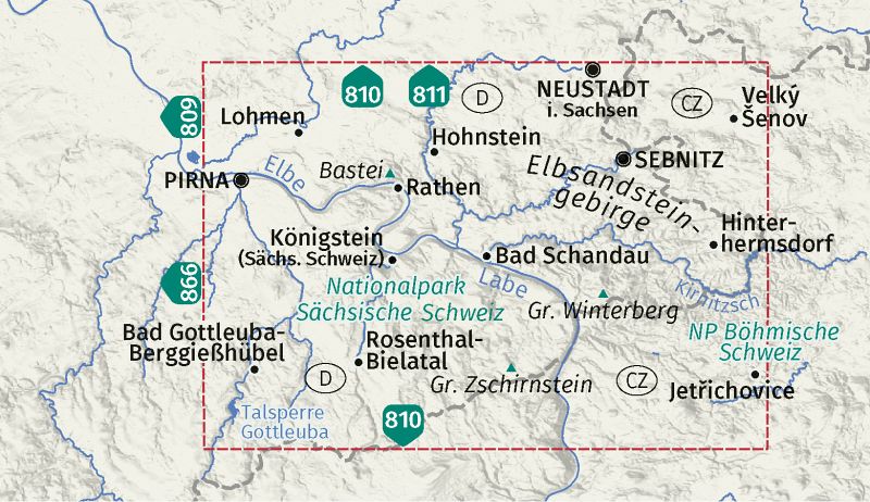 Ausstattung der Wanderkarte Elbsandsteingebirge, Nationalpark Sächsische Schweiz, Nationalpark Böhmische Schweiz:
