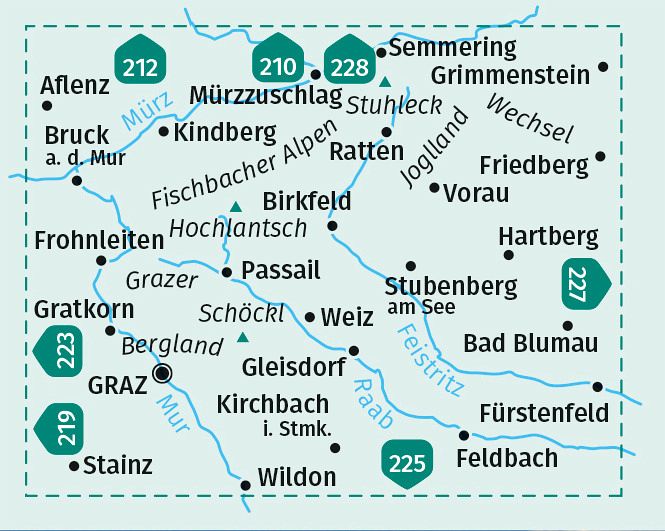 - Das Grazer Bergland liegt nördlich von Graz, höchste Erhebung ist der Hochlantsch (1720 m). Zu den beliebten Ausflugszielen gehören die Bärenschützklamm und die Raabklamm am Fuß des Osser.