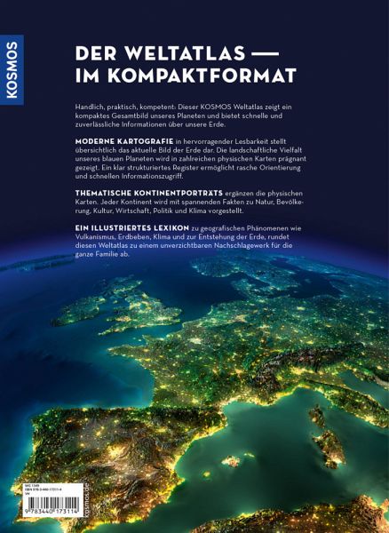 Der "Kosmos Weltatlas Kompakt" bietet schnelle Orientierung, umfangreiches Wissen und digitale Kartografie in höchster Qualität, und das in einer handlichen, leichten und kleinen Ausgabe. Seine Besonderheiten: Übersichtliche Karten in unterschiedlichen Maßstäben für die Erde, Kontinente, Länder und Regionen. Als einziger Kompaktatlas enthält er einen illustrierten lexikalischen Teil mit geografischen Basisinformationen über die Erde. Maßstäbe:Weltkarten 1:30 MillionenKontinentkarten 1:15 MillionenLänderkarten 1:5 Millionen