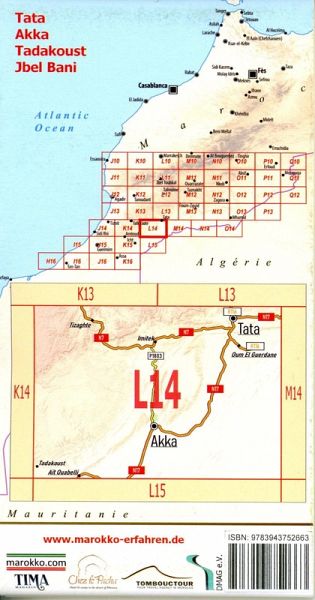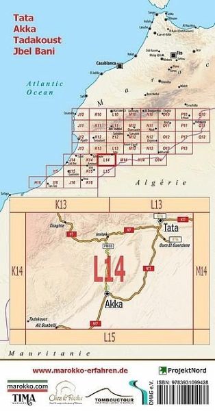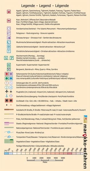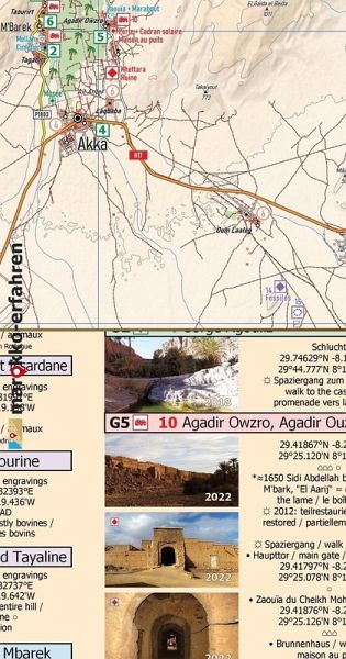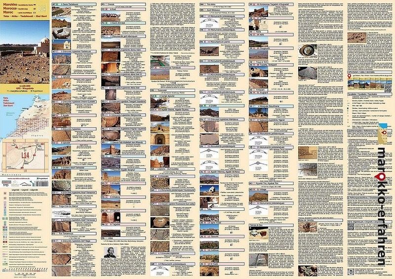 Dreisprachige (de. / en. / frz.) äußerst detaillierte touristische Landkarte / Reiseführer von Marokko mit über 160 Zielen + 88 davon mit Koordinatenangabe + Hintergrund-Informationen zur Geschichte, zu Besichtigungsmöglichkeiten und weiteren Besonderheiten- Oasen Tata und Akka an der N17- mit dem rekonstruierten Minarett von Agadir Amghar- kleine seltene Höhlenmalerei- Sonnenuhren und Wasseruhren in Tadakoust, Agadir l'Henna und Agadir Owzro, auch Agadir Ouzrou genannt- präislamische Monumente in Antennen- und Halbmondform ("Croissant")- Spuren von Khettaras- zahlreiche Felsgravuren-Felder bei Oum Laaleg sowie zwischen Akka und der N7 - Karst Imitek - oberirdische Geländeformen- Zaouïas, Moscheen und jüdische Friedhöfe- Stationen von Charles de Foucauld auf seinem Fußweg von Tissint nach Mogador (Essaouira)- Wochenmarkttage (Souks)Rinder weiden auf sattgrünen Feldern zwischen Antilopen und Gazellen. Ab und zu nähert sich ein Elefant, gar ein Löwe -so hat sich die Gegend entlang der Flüsse Assa und Akka zwischen Jbel Bani bis zum Oued Drâa vor tausenden von Jahren präsentiert. Den Spuren dieser Zeit folgend kann man sich aktuell in diese Zeit hineindenken.Traditionell entstandene Systeme zur gerechten Bewässerung in Oasen lassen sich auch heute hautnah erleben und verdeutlichen eindrucksvoll die Bedeutung des Wassers.Die Biografie des in Akka geborenen Rabbiners Abi Serur Mordechai ist eng verknüpft mit der Forschungsreise von Charles de Foucauld, dessen Wanderung an zahlreich benannten Punkten nachvollzogen werden kann.Zwischen Anti-Atlas und Jbel Bani wächst unscheinbar die Wüstenrose, die Echte Rose von Jericho zwischen den Steinen, deren Überlebensstrategie beschrieben ist.Kartographische Beratung durch Prof. Dr. Uwe Ulrich Jäschke, DresdenKonzept und Realisierung www.marokko-erfahren.de [LINK: www.marokko-erfahren.de/karten.html#l14]