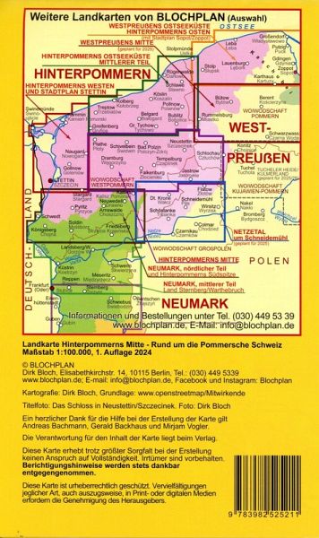Die Landkarte "Hinterpommerns Mitte" stellt das pommersche Binnenland zwischen Plathe/Ploty und Neustettin/Szczecinek dar. Außerdem werden Teile der zwischen 1919 und 1938 existierenden preußischen Provinz Grenzmark Posen-Westpreußen wiedergegeben. Kleine Städte wie Tempelburg/Czaplinek, Falkenburg/Zlocieniec, Bad Polzin/Polczyn-Zdroj oder Schlochau/Czluchow und viele stille Dörfer in einer überraschend ansprechenden Landschaft, die von Hügeln und vielen zum Teil glasklaren Seen geprägt ist lassen diese Gegend zu einer idealen Sommerurlaubskulisse werden. Der Name Pommersche Schweiz wurde nicht ohne Grund vergeben. Dazu gibt es eine Vielzahl gut ausgebauter Radrouten auf stillgelegten Bahnstrecken und mehrere sehr naturnahe Flüsse mit einer gut ausgebauten Infrastruktur zum Kanu- oder Kajakfahren. Und für Freunde der Militärgeschichte zeugen die vielen Hinterlassenschaften der sogenannten Pommernstellung/Wal Pomorski oder die einstige Militärstadt Groß Born/Borne Sulinowo von denkriegerischen Wechselfällen des 20. Jahrhunderts.Im sowohl für Autofahrer, als auch für andere touristisch Interessierte gut lesbaren Maßstab 1:100.000 werden detailliert alle wichtigen Sehenswürdigkeiten, wichtige und ausgebaute Fahrrad-Routen, ausgewählte Kanu-Routen, alle Fern- und Landstraßen sowie die wichtigsten Stadtstraßen, dazu intakte, stillgelegte sowie abgebaute Eisenbahnstrecken und zur besseren Orientierung geschichtlich interessierter Nutzer neben den aktuellen auch die wichtigsten historischen Verwaltungs- und Staatsgrenzen gezeigt. Alle in diesem Gebiet vorhandenen Orte und Wohnplätze - auch die nach 1945 verschwundenen - sind mit ihren polnischen und ihren deutschen Namen dargestellt und in 2 Ortsregistern auf der Rückseite verzeichnet.