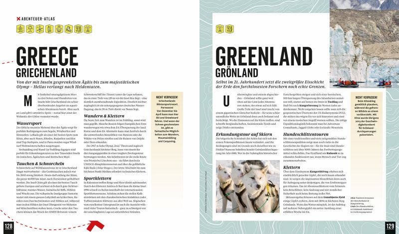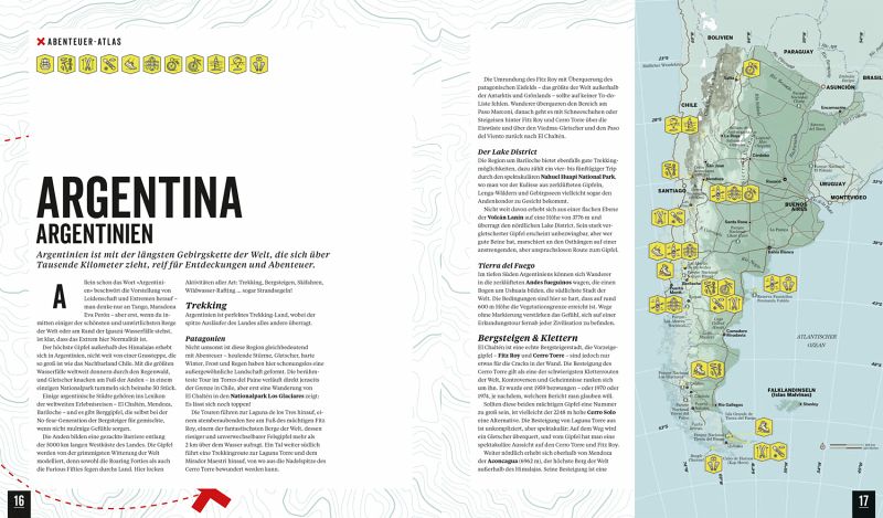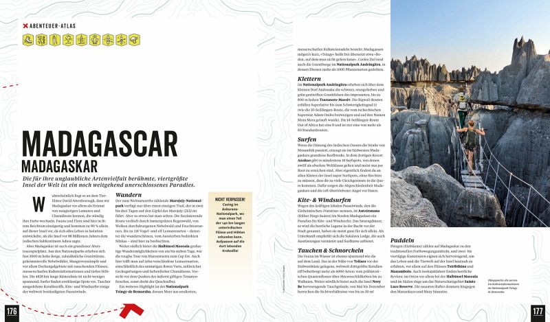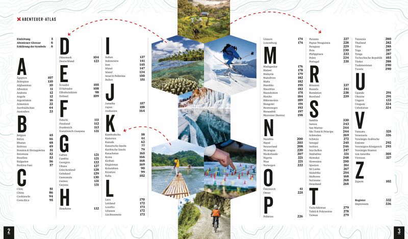 Nach der Auflistung der Länder nach Buchstaben, einer kleine Einleitung und einer Erklärung der Symbole wird auf einer Weltkarte die Top Ten aufgelistet. Danach sind die Länder einzeln alphabetisch aufgeführt. Diese sind von der Länge unterschiedlich lang, so dass manche Länder mit einer Seite auskommen müssen, andere gehen mit verschiedenen Abenteuer über mehrere Seiten. Am Anfang befindet sich bei längeren Artikeln immer ein Kartenausschnitt, auf dem dann die Abenteuer eingezeichnet sind.