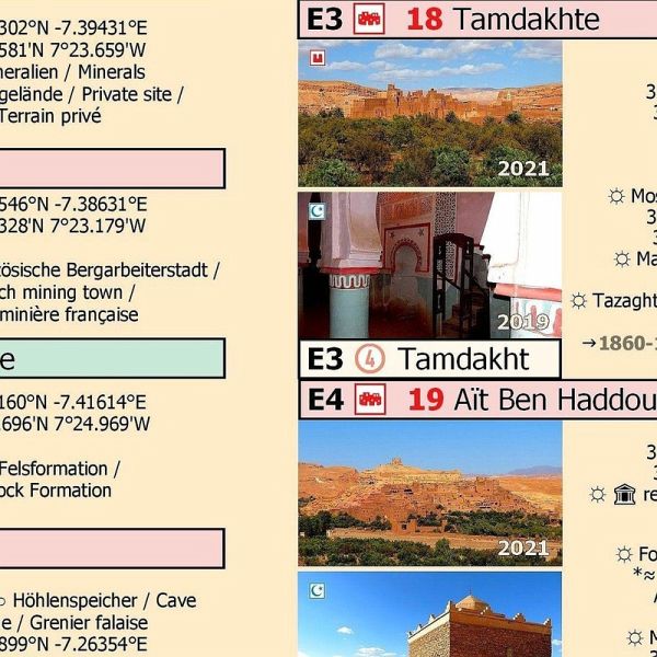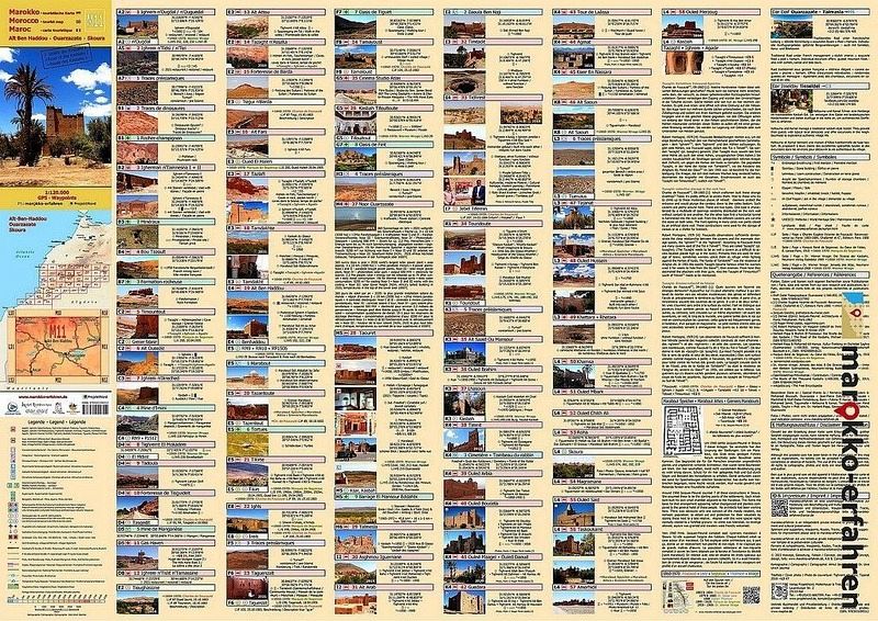 Im Rahmen des privaten unabhängigen europaweiten Projektes von marokko-erfahren zur Förderung von Beschäftigung und Kulturerhalt in Marokko ist ein anwenderorientiertes Blattwerk Marokkos als Grundlage zahlreicher touristischer Karten entstanden. Dafür konnte der Dresdner Geograph, Kartograph und international anerkannte Namibia-Experte Prof. Dr. Uwe Ulrich Jäschke gewonnen werden, dessen Wissen und Können prägend für die Karten ist.Die touristischen Karten sind durch ihre plastische, reliefartige Darstellung der Höhenstrukturen mit zusätzlichen Höhenlinien sehr anwenderfreundlich. Ob mit Auto, Motorrad, Bike oder zu Fuß - jeder, der Marokko erfahren möchte findet hier zahlreiche Informationen. Leicht zu unterscheiden sind Wanderwege, Pisten und befestigte Straßen. Für die Orientierung im Gelände werden sogar temporäre Flussläufe dargestellt.Alles, was oftmals den Umgang mit Papierkarten erschwert, wurde ausgeschlossen: Das stabile, unkompliziert gefaltete Papier (im Format A1) ist gegen eine Blendwirkung durchgängig gefärbt und jedes Blatt überdeckt sich umlaufend mit dem Nachbarblatt um einige Kilometer. Eine komplette Seite ist der mit Koordinaten-Gitter versehenen, GPS-kompatiblen farbigen Karte vorbehalten. Die Legende kann bei Bedarf schnell auf die Kartenseite eingeklappt werden.Die auf der Karte markierten Sehenswürdigkeiten sind durch ein einfaches 4-Farb-Leitsystem für die unterschiedlichen Rubriken unterscheidbar und auf der Rückseite über das integrierte Suchraster sowie das Aufgreifen des Farbsystems schnell wieder auffindbar. Unterschieden werden die Rubriken Architektur, Prähistorie, Natur + Leben (einschließlich Geologie), sowie Religion. Zusätzlich gibt es meist ein repräsentatives Farbfoto sowie Hintergrund-Informationen zur Geschichte, zu Besichtigungsmöglichkeiten und anderen Besonderheiten.Direkt markiert sind zusätzlich zu den touristischen Highlights die für das Land so typischen Souks, die Wochenmärkte, um dieses lohnenswerte Erlebnis in der individuellen Planung aufzunehmen zu können. Größere Städte werden ergänzende Stadtpläne enthalten. Redaktionelle thematische Erläuterungen zu den unterschiedlichsten, das jeweilige Blatt betreffende Themen werden das Werk abrunden.Fazit: Das Produkt ist hilfreich, informativ und einfach zu handhaben. Eine unentbehrliche Ergänzung zum Reiseführer für unternehmungslustige Pauschalurlauber gleichermaßen wie für individuell Reisende, die ganz detaillierte Informationen in einem konkreten Gebiet suchen.