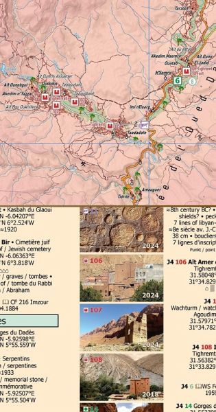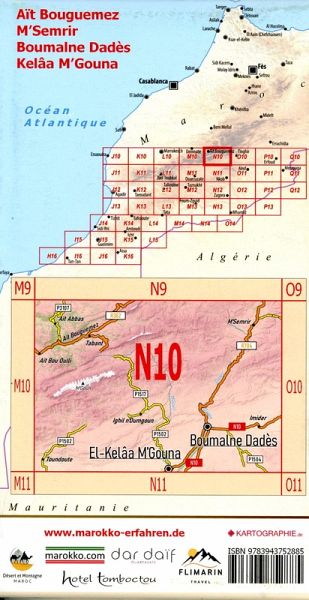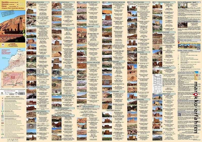 N10: Aït Bouguemez - M'Semrir - Boumalne Dadès - Kelâa M'Gouna + Straße der Kasbahs III + GPS-WaypointDeutsch / Englisch / Französisch  1:120.000   ca. 84 x 59 cm   gefaltet 10,5 x 20 cm   zahlreiche Fotos   Dreisprachige (de. / en. / frz.) äußerst detaillierte touristische Landkarte / Reiseführer von Marokko.Von den über 200 auf der Kartenseite markierten Zielen werden mehr als 150 auf der Reiseführerseite detaillierter beschrieben und sind mit Koordinatenangaben versehen.Mit Hintergrund-Informationen zur Geschichte, zu Besichtigungsmöglichkeiten und weiteren Besonderheiten.- Wanderungen in nahezu unberührter Natur rund um den Jbel M'Goun- Apfelparadies auf fast 1800m Höhe im Aït Bouguemez-Tal- faszinierende Wohnburgen in authentischen Dörfern- Fahrspaß auf der bekannten Serpentinenstraße im Dadès-Tal- Höhlen - einst auch bewohnt - und Quellen nicht nur im Rosen-tal- Ighrem Sidi Mossa in exponierter Lage- beeindruckende Passquerungen durch den Hohen Atlas- Kasbahs in Toundoute, Boumalne Dadès und El-Kelâa M'Gouna- Hinweise auf Beschreibungen von Charles de Foucauld und Werner Wrage- Wochenmarkttage (Souks)Das Blatt wird dominiert von den drei Hauptflüssen im Aït Bouguemez- und im Dadès-Tal sowie im Tal des M'Goun, dessen Unterlauf als Tal der Rosen bezeichnet wird. Eine Ballung an Sehenswürdigkeiten entlang dieser Täler sorgt für eine neue Strukturierung der Ziele auf der Reiseführerseite. Innerhalb der Grenzen des Geoparc UNESCO du M'Goun wird auf interessante Punkte hingewiesen.Ein guter Mix zwischen dicht besiedelten Tälern mit lebhafter Infrastruktur und der Einsamkeit in ländlichen Bereichen lädt zum Verweilen ein. In einer stillgelegten Salzmine im Tal des Oued Tabia überraschen bizarre Salzkristalle. Dinosaurier haben überall ihre Spuren hinterlassen, in manch einer Grotte spürt man noch die Anwesenheit ehemaliger Bewohner.Freunde der Berberarchitektur sind in den Tälern gut aufgehoben. Bauwerke von teils beachtlicherHöhe in verschiedenen Erhaltungszuständen sind dankbare Fotomotive, können teilweise besichtig werden.Auch auf diesem Blatt besticht erneut die Kombination von Sehenswürdigkeiten und herrlicher Natur.Kartographische Beratung durch Prof. Dr. Uwe Ulrich Jäschke, DresdenKonzept und Realisierung www.marokko-erfahren.deWeitere Informationen:www.marokko-erfahren.de/informieren/landkarten-marokko-erfahren/n10-ait-bouguemez-msemrir-boumalne-dades-kelaa-mgouna-strasse-der-kasbahs-iii