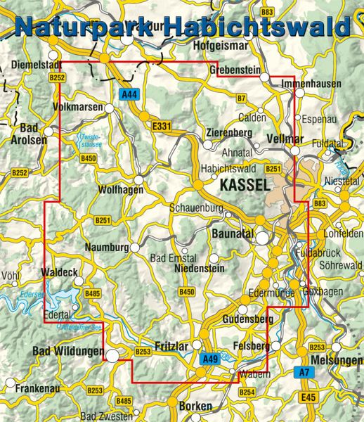Der 1962 gegründete Naturpark Habichtswald liegt westlich von Kassel, neben dem Bergpark Wilhelmshöhe und dem namensgebenden Habichtswald. Die abwechslungsreiche Landschaft des Naturparks bietet vielfältige Möglichkeiten per Pedes oder mit dem Rad die Region kennen zu lernen. So unterhält der Naturpark rund 50 Wanderparkplätze, von denen stets mehrere Rundwege starten.Neben zahlreichen regionalen und überregionalen Wanderwegen bietet der prämierte Habichtswaldsteig die Querung des Naturparks Habichtswald von Zierenberg bis zum Edersee. Der etwa 85 Kilometer lange Steig verbindet die Wacholderheiden am Dörnberg mit dem UNESCO Weltnaturerbe der Buchenwälder im Nationalpark Kellerwald-Edersee. 10 Extratouren entlang des Habichtswaldsteig laden zum entdecken ein.Die neue überarbeitete 5. Ausgabe der reiß- und wetterfesten Rad- und Wanderkarte Naturpark Habichtswald stellt den Naturpark mit dem aktualisierten Rad- und Wanderwegenetz im übersichtlichen Maßstab 1:35 000 vor. Neben dem Habichtswaldsteig mit seinen Extratouren werden auch die Eco-Pfade und die vielfältigen Radwege dargestellt. Eine Detailkarte vom Bergpark Wilhelmshöhe rundet das Angebot ab.