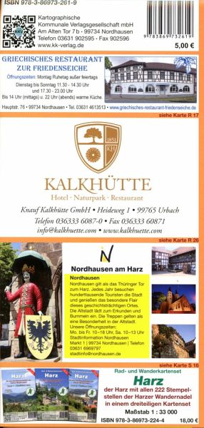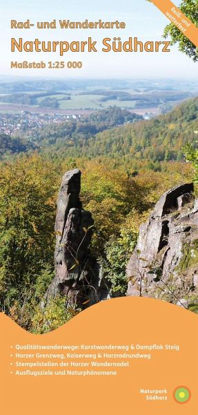 Im Norden Thüringens liegt der ca. 267 km² große Naturpark Südharz. Er grenzt im Osten an das Biosphärereservat Karstlandschaft Südharz und im Norden und im Nordwesten an den Naturpark Harz. Er umfasst Teile des Südharzes, der Gipskarstlandschaft mit ihren Dolinen, Bachschwinden, Karstquellen, Erdfallseen und Gipssteilwänden, und des sich anschließenden Zechsteingürtels.In den vielen Höhlen leben zahlreich Fledermausarten und auf den Trockenrasenflächen blühen die Orchideen. Bei Wanderungen können Sie mit ein wenig Glück den Feuersalamander beobachten und die Südhänge zeichnen sich durch eine besondere Arten- und Blütenpracht aus.Die ehemalige innerdeutsche Grenze, das Grüne Band, kann auf dem Harzer Grenzweg erwandert werden.Die neue aktualisierte, 2. Ausgabe der Rad- und Wanderkarte Naturpark Südharz stellt im detaillierten Maßstab 1:25 000 den gesamten Naturpark mit seinem Rad- und Wanderwegenetz vor. Die punktgenaue Darstellung der Stempelstellen der Harzer Wandernadel erleichtert den Wanderern das Auffinden der schönsten Ausflugsstellen im Harz.Ein integriertes UTM-Gitter ermöglicht die Orientierung im Gelände mit Hilfe eines GPS- Gerätes und eine Geländeschummerung visualisiert das Mittelgebirge.