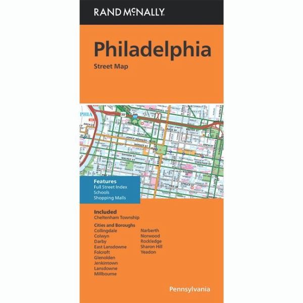 Rand McNally's folded map for Philadelphia is a must-have for anyone traveling in and around this part of Pennsylvania, offering unbeatable accuracy and reliability at a great price. Our trusted cartography shows all Interstate, U.S., state, and county highways, along with clearly indicated parks, points of interest, airports, county boundaries, and streets. The easy-to-use legend and detailed index make for quick and easy location of destinations. You'll see why Rand McNally folded maps have been the trusted standard for years. - Regularly updated. - Full-color maps. - Clearly labeled Interstate, U.S., state, and county highways. - Indications of parks, points of interest, airports, county boundaries, schools, shopping malls, downtown & vicinity maps. - Easy-to-use legend. - Detailed & full street index. - Convenient folded size. Coverage Area Communities Included: Cheltenham, Collingdale, Colwyn, Derby, East Lansdowne, Folcroft, Glenolden, Jenkintown, Lansdowne, Millbourne, Narberth, Norwood, Rockledge, Sharon Hill, Yeadon plus downtown enlargement. Product Details: Measures 9.5' x 4' and folds out to 40' x 28'.